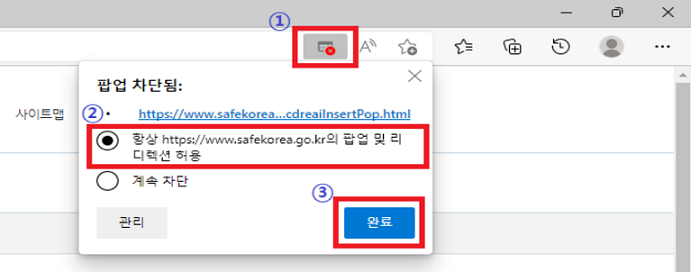 팝업차단 해지 방법 1. 엣지(Edge) ① 주소창에 있는 팝업차단 아이콘을 클릭해 주세요. ② "항상 https://www.safekorea.go.kr의 팝업 및 리디렉션 허용"을 체크합니다. ③ 완료 버튼을 클릭합니다.