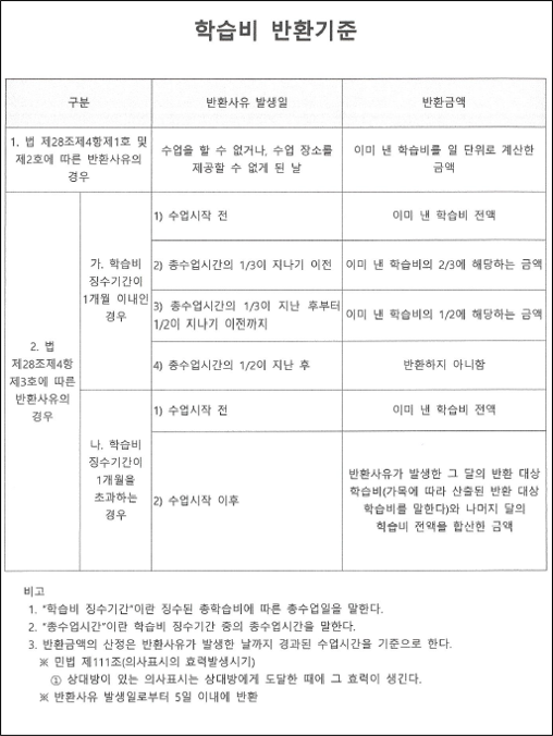 평생교육법 시행령에 따른 학습비 반환기준
